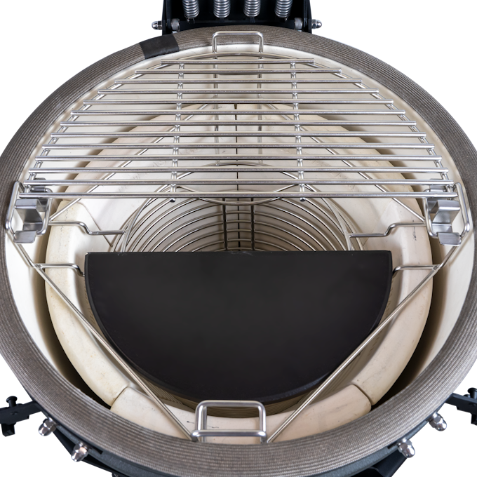 Die Twilight Zone! Teilen Sie den Holzkohlekorb in zwei Zonen, indem Sie eine Seite mit Holzkohle füllen, den Halbmondstein und das Gitter darüber legen, um eine direkte und eine indirekte Zone zu schaffen. In Kombination mit unseren Halbmond-Accessoires sind die Möglichkeiten endlos.